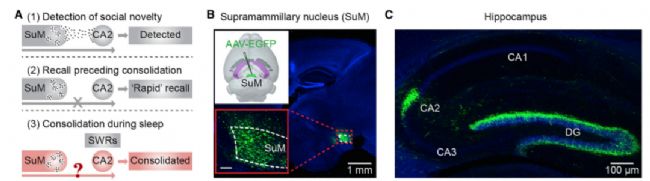 社會(huì)記憶是一個(gè)基本的認(rèn)知過(guò)程,幫助動(dòng)物識(shí)別并記憶同伴,這種能力在神經(jīng)系統(tǒng)疾病中受損。海馬CA2區(qū)神經(jīng)元響應(yīng)外界社交新奇刺激,編碼社交記憶信號(hào)。激活下丘腦乳頭上核(SuM)到CA2區(qū)的谷氨酸能神經(jīng)環(huán)路可影響社交新奇信息的編碼,但抑制該環(huán)路并不影響。