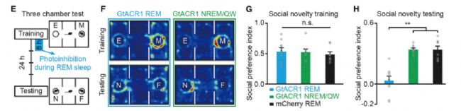 在三箱社交行為中,在訓(xùn)練階段兩側(cè)各放置空箱子和同伴小鼠,結(jié)束后小鼠更多時(shí)間停留在同伴小鼠一側(cè),表現(xiàn)出社交偏好性。在測(cè)試階段兩側(cè)各放置熟悉的同伴小鼠和陌生同伴小鼠,實(shí)驗(yàn)小鼠更愿意呆在陌生小鼠一側(cè),表現(xiàn)出社交新穎性。但在REM時(shí)期光抑制SuM-CA2神經(jīng)環(huán)路后可小鼠無(wú)法區(qū)分熟悉同伴和陌生同伴,因此對(duì)社交不表現(xiàn)新穎性。