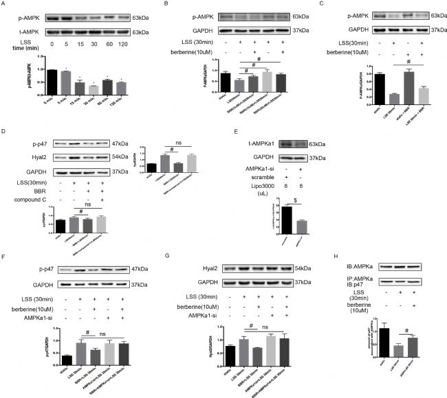考慮到小檗堿恢復(fù)了低剪切應(yīng)力誘導(dǎo)的AMPK去磷酸化,實驗試圖確定小檗堿是否通過激活 AMPK減弱低剪切應(yīng)力誘導(dǎo)的p47phox磷酸化和 Hyal2 活化。結(jié)果表明,在與小檗堿和化合物C(AMPK抑制劑)共同處理后,低剪切應(yīng)力可以消除p47phox和Hyal2對小檗堿的響應(yīng)(圖3 D)。為了進(jìn)一步在小檗堿處理中連接 AMPK 與 p47phox和Hyal2,通過敲低AMPKα1,然后用小檗堿預(yù)處理24小時,在低剪切應(yīng)力下,小檗堿不能抑制p47phox磷酸化和Hyal2活化(圖3 E-G)。此外,實驗確定了p47phox和Hyal2的結(jié)合是否也受到小檗堿處理的影響。結(jié)果表明,小檗堿降低了低剪切應(yīng)力誘導(dǎo)的p47phox/Hyal2 的解離(圖3 H)。所有數(shù)據(jù)都顯示,小檗堿通過 AMPK 激活抑制p47phox和 Hyal2的活化。