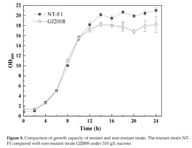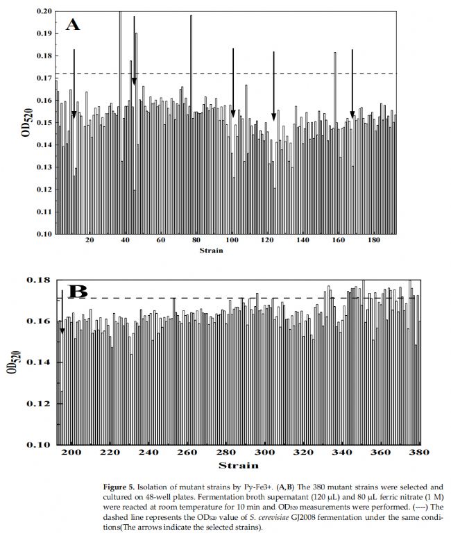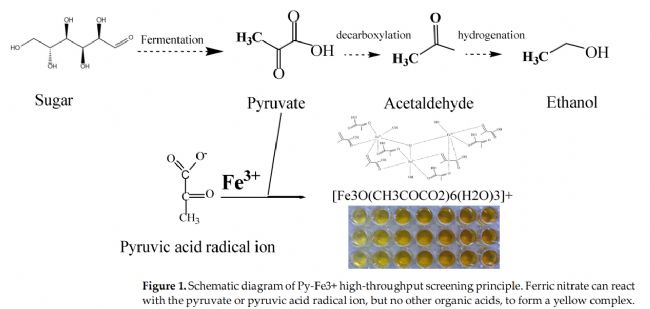 研究團(tuán)隊(duì)建立并實(shí)施了一種新的釀酒酵母誘變篩選策略。發(fā)酵培養(yǎng)基中硝酸鐵與丙酮酸(或丙酮酸自由基離子)反應(yīng)形成的黃色物質(zhì)在OD520處具有很強(qiáng)的線性關(guān)系。來(lái)自同一釀酒酵母的衍生酵母的乙醇發(fā)酵能力與發(fā)酵液中丙酮酸的濃度成反比。通過(guò)ARTP誘變構(gòu)建大容量突變庫(kù),并通過(guò)高通量Py-Fe3+篩選方法,篩選出具有高糖耐量的突變釀酒酵母菌株。進(jìn)化的釀酒酵母NT-F1的乙醇產(chǎn)量達(dá)到135.58 g/L,生產(chǎn)效率達(dá)到81.64%,比出發(fā)菌株GJ2008高20.46%。本研究所建立的方法及其應(yīng)用將有效促進(jìn)釀酒酵母培養(yǎng)物的高精度篩選,并提高乙醇合成的效率。