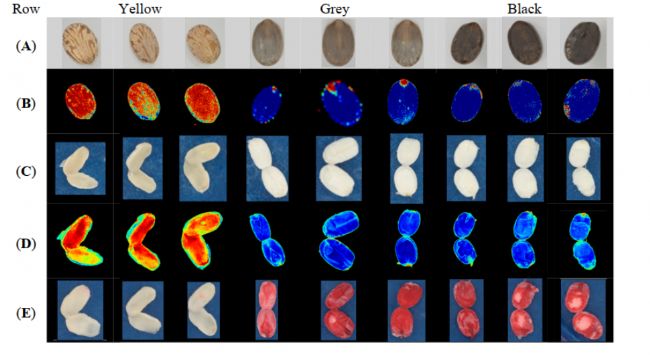 本文是對蓖麻的第一項研究,其中使用多光譜成像測量了種皮顏色反射,并根據(jù)種子活力進行了分類。Lucena 等人實施了類似的蓖麻種子分離,基于人眼的檢查,在我們的研究中也進行了評估作為主要步驟(A 行,圖 2)。圖 2 提供了生態(tài)型 Esfahan 種子的概覽,分為三個種皮顏色類別;黃色、灰色和黑色。行A中種子的3×3圖像的視覺比較表明所有三種種皮顏色類別之間的顏色變化。B行顯示A行種子的變換圖像;此處黃色種子顯示為紅色,灰色和黑色種子顯示為藍色。C行和D行顯示切割的種子,觀察到與整個種子相似的模式,展示了圖像的轉換如何導致切割的黃色種子呈現(xiàn)紅色,而可行的切割種子呈現(xiàn)藍色外觀。E行顯示四唑染色的結果。根據(jù)脫氫酶活性,黃色種子沒有染色,而灰色和黑色種子將活組織染成紅色。因此,我們的結果表明,多光譜成像可以是蓖麻種子活力測試中的一種非破壞性方法,因為我們已經(jīng)觀察到種皮顏色反射與通過四唑測試獲得的活力之間令人滿意的正相關。