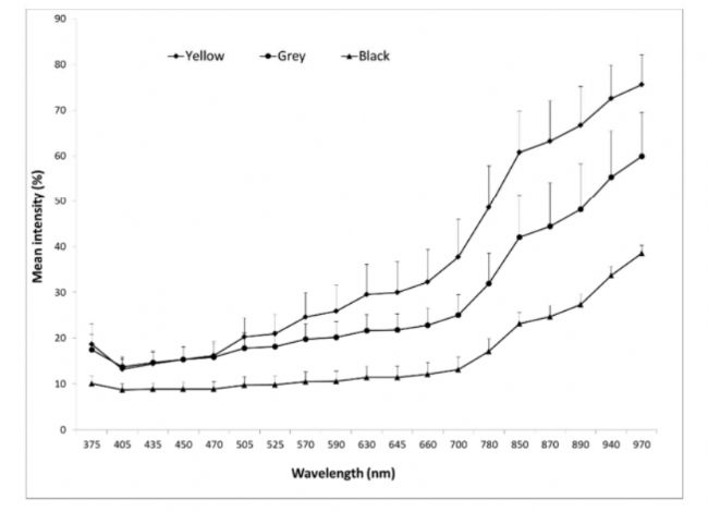 圖3.基于三種種子類別的種皮表面反射的平均反射光譜,確定為黃色、灰色和黑色種子