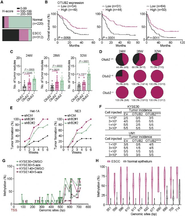 為了研究OTUB2在上消化道鱗狀細(xì)胞癌中的功能,作者首先檢測(cè)了其在正常食管上皮及食管鱗狀細(xì)胞癌(ESCC)組織中的表達(dá)情況,相較于ESCC組織,OTUB2在正常食管上皮中高表達(dá),且預(yù)后分析表明OTUB2高表達(dá)的食管鱗狀細(xì)胞癌患者預(yù)后更好。于是,作者構(gòu)建了一個(gè)OTUB2敲除ESCC小鼠模型,OTUB2敲除ESCC小鼠中發(fā)生舌瘤結(jié)節(jié)數(shù)量及ESCC發(fā)生率明顯高于野生型ESCC小鼠。接下來(lái),作者將OTUB2敲除的上皮細(xì)胞系異種移植到小鼠體內(nèi),觀察OTUB2敲除是否可以促進(jìn)人鱗狀細(xì)胞癌的發(fā)生,結(jié)果發(fā)現(xiàn),OTUB2沉默的上皮細(xì)胞表現(xiàn)出較強(qiáng)的致癌能力,進(jìn)一步驗(yàn)證了OTUB2在上消化道鱗狀細(xì)胞癌發(fā)生中的抑癌作用。