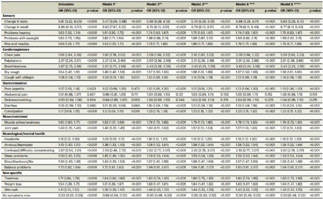 報告最多長期后遺癥包括疲倦、頭痛、失去味覺、肌無力、呼吸困難、腦霧等。與從未感染組相比,感染者失去嗅覺的可能性幾乎高出9倍,味覺喪失的風(fēng)險高出6倍,呼吸困難的風(fēng)險高出3倍。