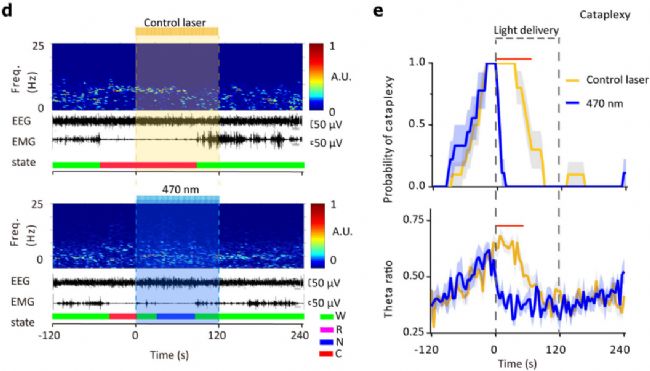 臨床上發(fā)作性睡病患者,在發(fā)生猝倒時(shí),常伴有腦電信號(hào)theta波升高、肌張力消失等REM樣睡眠表型。因此,作者進(jìn)一步探討了dDpMe中的GABA能神經(jīng)元在猝倒治療中的應(yīng)用。在下丘腦食欲素能神經(jīng)元特異性損毀的小鼠猝倒模型中,特異性激活dDpMe中的GABA能神經(jīng)元可有效阻止小鼠猝倒發(fā)作。這一結(jié)果證實(shí),dDpMe中的GABA能神經(jīng)元在抑制猝倒發(fā)作中發(fā)揮了重要作用,同時(shí)也進(jìn)一步詮釋了發(fā)作性睡病的病理生理機(jī)制。