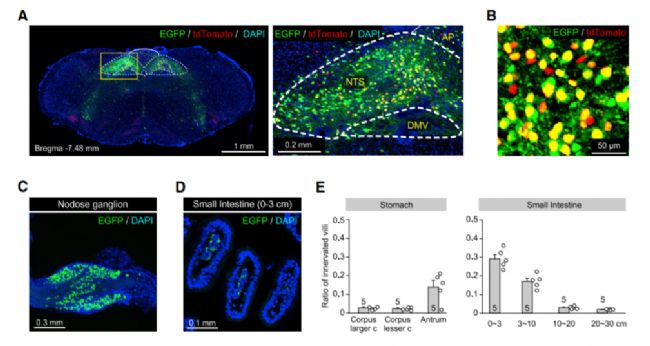 逆行示蹤病毒標記DVC-Tac1神經(jīng)元,在中央杏仁核、終紋床核、下丘腦室旁核等大腦和迷走神經(jīng)感覺神經(jīng)元觀察到EGFP陽性細胞。有意思的是,其中EGFP陽性迷走神經(jīng)感覺神經(jīng)元的軸突在胃竇絨毛和小腸近段形成粘膜末梢,這些粘膜末梢靠近分泌5-HT的腸嗜鉻細胞(EC細胞)。