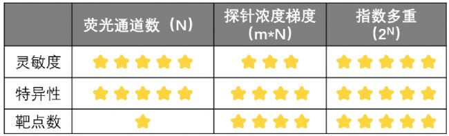 基于熒光通道數(shù)的增加和基于探針濃度梯度增加,均可以在一定程度上提高數(shù)字PCR檢測(cè)重?cái)?shù),然而只能達(dá)到“線性”增加的目的;谔结槤舛忍荻鹊亩嘀貦z測(cè)技術(shù)雖然可以顯著增加多重能力,但由于無(wú)法避免cross-reactivity現(xiàn)象,不能確保僅獲得位點(diǎn)特異性的分簇,因此穩(wěn)定性不足、靈敏度較差,難以滿足臨床級(jí)別的數(shù)據(jù)要求。而基于創(chuàng)新的且數(shù)字PCR獨(dú)特適用的熒光編碼技術(shù)可以實(shí)現(xiàn)“指數(shù)”級(jí)的多重檢測(cè),顛覆性的提高數(shù)字PCR檢測(cè)重?cái)?shù),更全面的覆蓋臨床應(yīng)用多場(chǎng)景需求。