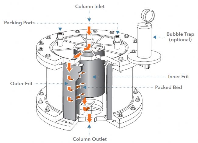 Superflo®柱基于徑向流色譜技術(shù)。由于外通道的橫截面積較大且床層深度較低,所以Superflo®柱可支持非常高的流速和非常低的運(yùn)行壓力。