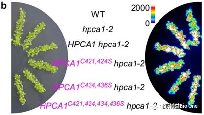 圖5 | Cys突變的HPCA1 × hpca1-2突變體中,Ca2+成像發(fā)光信號大幅度減弱,即Cys突變的HPCA1無法恢復(fù)hpca1-2突變體的表型。