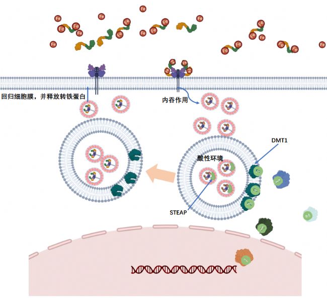 轉(zhuǎn)鐵蛋白負(fù)責(zé)運(yùn)載由消化管吸收的鐵和由紅細(xì)胞降解釋放的鐵。以三價(jià)鐵復(fù)合物(TF-Fe3+)的形式進(jìn)入骨髓中,供成熟紅細(xì)胞的生成。轉(zhuǎn)鐵蛋白(TF)結(jié)合鐵是通過與其受體,即Transferrin Receptor 1(TFR1)相互作用而實(shí)現(xiàn)的。TFR1 是一種表達(dá)于細(xì)胞表面的糖蛋白,由兩個(gè)同源二聚體的亞基通過二硫鍵連接而成。在細(xì)胞表面,TF與Fe3+相互作用形成全鐵-TF,并與TFR1受體結(jié)合,在細(xì)胞內(nèi)吞作用下進(jìn)入核內(nèi)體。在偏酸性核內(nèi)體的環(huán)境中,F(xiàn)e3+與TF分離,同時(shí)前列腺蛋白(STEAP)將Fe3+還原為Fe2+,并被二價(jià)金屬離子轉(zhuǎn)運(yùn)蛋白1(DMT1)轉(zhuǎn)運(yùn)到細(xì)胞質(zhì)中,然后釋放了Fe3+的TF與TFR1組成TF/TFR1復(fù)合物,通過胞吐作用回游到細(xì)胞表面。在細(xì)胞表面,轉(zhuǎn)鐵蛋白(TF)與受體TFR1分離,成為脫鐵-TF,然后再與Fe3+重新結(jié)合參與鐵循環(huán)。整個(gè)過程完成后TF和TFR1被循環(huán)利用,進(jìn)入細(xì)胞攝取鐵的下一個(gè)周期中。