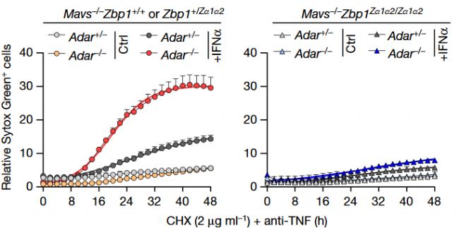 為了確定哪些信號(hào)通路導(dǎo)致ADAR1缺陷細(xì)胞死亡,用IFNα處理原代小鼠肺成纖維細(xì)胞以誘導(dǎo)ZBP1表達(dá),為了排除自發(fā)MDA5和MAVS或TNF信號(hào)傳導(dǎo)對(duì)細(xì)胞存活的混雜影響,加入TNF中和抗體。用IFNα和蛋白質(zhì)合成抑制劑放線菌酮 (CHX) 刺激 ADAR1 缺陷型成纖維細(xì)胞,增強(qiáng)TNF誘導(dǎo)的細(xì)胞死亡,誘導(dǎo)ZBP1介導(dǎo)的細(xì)胞死亡(圖4)。結(jié)果證明