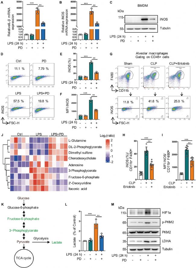 為了評(píng)估細(xì)胞膜EGFR激活對(duì)膿毒癥巨噬細(xì)胞M1/M2表型平衡的影響,作者使用LPS刺激BMDMs和RAW264.7兩種巨噬細(xì)胞向M1表型轉(zhuǎn)變。研究發(fā)現(xiàn)PD168393處理和Erlotinib處理(EGFR抑制劑)均顯著下調(diào)了M1標(biāo)志物iNOS的表達(dá)水平,即表明細(xì)胞表面的EGFR磷酸化促進(jìn)內(nèi)毒素血癥或敗血癥相關(guān)的M1巨噬細(xì)胞的激活。為了進(jìn)一步闡明EGFR對(duì)內(nèi)毒素血癥代謝的影響,作者開展了代謝組學(xué)分析,結(jié)果表明LPS組磷酸戊糖通路(PPP)和糖酵解中間產(chǎn)物增加、PD168393的處理降低HIF-1ɑ和乳酸脫氫酶A (LDHA)蛋白表達(dá)。綜上所述,抑制EGFR磷酸化可以減少巨噬細(xì)胞對(duì)LPS的糖酵解反應(yīng)(圖7)。