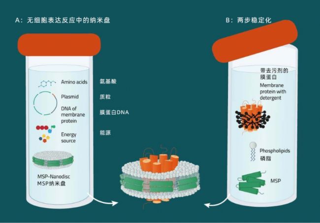 A:結(jié)合納米盤(pán)與無(wú)細(xì)胞表達(dá)系統(tǒng)從表達(dá)質(zhì)粒開(kāi)始,可在無(wú)細(xì)胞系統(tǒng)中生成膜蛋白。在整合了初生膜蛋白(8)的混合物中提供預(yù)組裝納米盤(pán)。不需要額外添加去污劑,這樣可以最大限度地減少偽影的存在。作為一個(gè)可選項(xiàng),可以將生物素;蛲凰貥(biāo)記等修飾包含在內(nèi)。