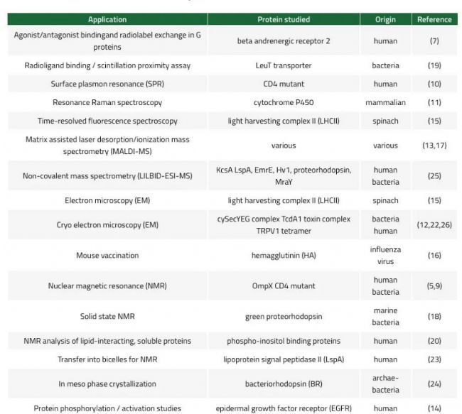 5. Hagn, F. et al. Optimized phospholipid bilayer nanodiscs facilitate high-resolution structure determination of membrane proteins. J.Am.Chem. Soc. (2013), 135:1919-1925