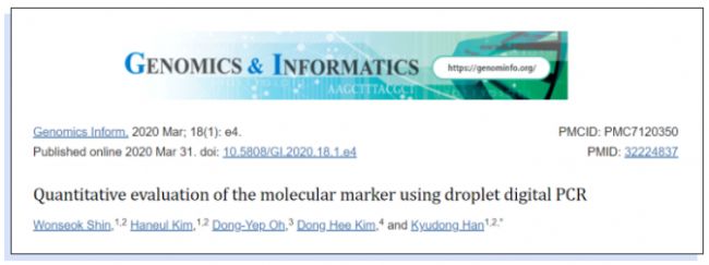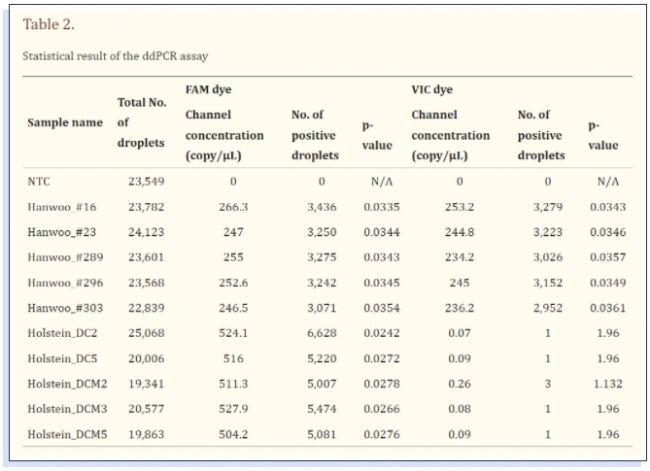 在之前的一項(xiàng)研究中,使用傳統(tǒng)的PCR方法和Sanger測序驗(yàn)證確定了由TE關(guān)聯(lián)缺失事件產(chǎn)生的韓牛特異性SV。它可以用作區(qū)分不同牛品種的分子標(biāo)記(即韓牛與荷斯坦牛)。然而,PCR存在缺陷,每個樣品都有各種最終拷貝定量。為了克服傳統(tǒng)PCR的局限性,并準(zhǔn)確評估先前研究中確定的韓牛特異性SV位點(diǎn),檀國大學(xué)生物醫(yī)學(xué)科學(xué)系聯(lián)合畜牧研究所和檀國大學(xué)醫(yī)學(xué)院,使用naica️®微滴芯片數(shù)字PCR系統(tǒng)對韓牛特異性SV位點(diǎn)進(jìn)行了更為精確的檢測,并將成果《Quantitative evaluation of the molecular marker using droplet digital PCR》發(fā)表在Genomics & Informatics雜志上。