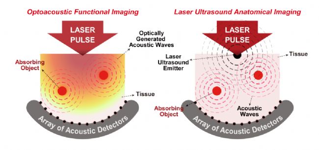 光聲成像是一種將光學激發(fā)與超聲檢測相結(jié)合的新興無創(chuàng)混合成像技術(shù)。在成像過程中,光聲造影劑吸收非電離脈沖激光并轉(zhuǎn)換為熱,通過熱彈性膨脹產(chǎn)生超聲波,利用寬頻超聲換能器對這些聲波進行檢測,根據(jù)聲波的到達時間即可構(gòu)建光聲圖像。