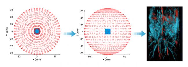 活體小動物固定在特制的 Holder上,由精密的旋轉(zhuǎn)馬達帶動完成 360° 的旋轉(zhuǎn);此時4束脈沖激光(兩正交,兩斜交)同時激發(fā),并照射在小動物皮膚表面;造影劑吸收光能,產(chǎn)生超聲信號,并被專業(yè)設(shè)計的超聲換能器接收(中心頻率為0.1-8.0 MHz),通過 DAQ 數(shù)據(jù)采取單元轉(zhuǎn)化,最后采用專用的3D重建軟件重建三維光聲圖像。