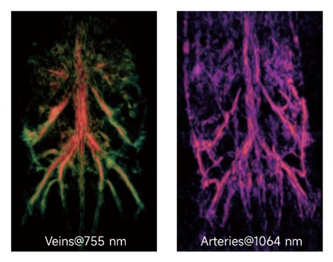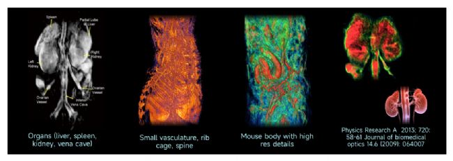 血紅蛋白造影,多功能地呈現(xiàn)良好的解剖特征。如圖所示為小鼠臟器、骨骼、淺表血管及腎臟血管成像。