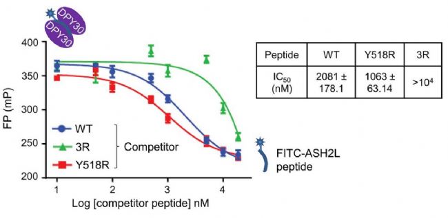 圖 13 在未標(biāo)記TAT-HA融合肽劑量增加的情況下使用純化的DPY30蛋白和FITC-ASH2L(510–529)多肽進(jìn)行熒光偏振分析(FPA)
