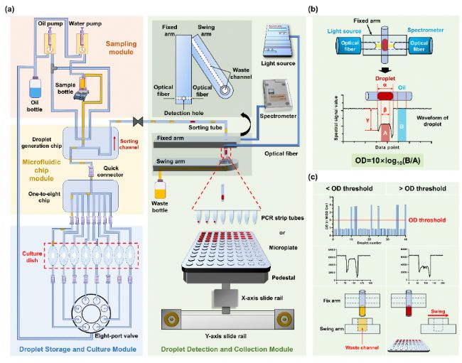 單克隆菌落的分離、培養(yǎng)和挑取是微生物研究的關(guān)鍵操作。1881年,Robert Koch發(fā)明了在固體平板上進(jìn)行微生物純培養(yǎng)的方法,已經(jīng)成為微生物單克隆培養(yǎng)和挑取的標(biāo)準(zhǔn)方法之一。然而在面對日益多樣的高通量需求時(shí),基于固體平板的方法由于通量低、培養(yǎng)基利用率低以及存在大量的人工操作,通常要消耗大量人力物力。雖然近些年也發(fā)展了一些整合菌落挑取儀、移液工作站等儀器與機(jī)械臂的自動(dòng)化工作站,但這種平臺復(fù)雜而昂貴。近年來液滴微流控技術(shù)的發(fā)展為自動(dòng)化高通量微生物培養(yǎng)和篩選提供了新的解決方案。然而目前大多數(shù)相關(guān)系統(tǒng)使用皮納升液滴,由于其體積小,導(dǎo)致檢測方面諸如檢測靈敏度低,高度依賴特定的化學(xué)試劑和探針,檢測設(shè)備復(fù)雜昂貴等問題。同時(shí)這些系統(tǒng)通常以堆疊的方式培養(yǎng)液滴,較難單獨(dú)和依次收集目標(biāo)液滴,不能完全實(shí)現(xiàn)單克隆菌落的單獨(dú)獲取。