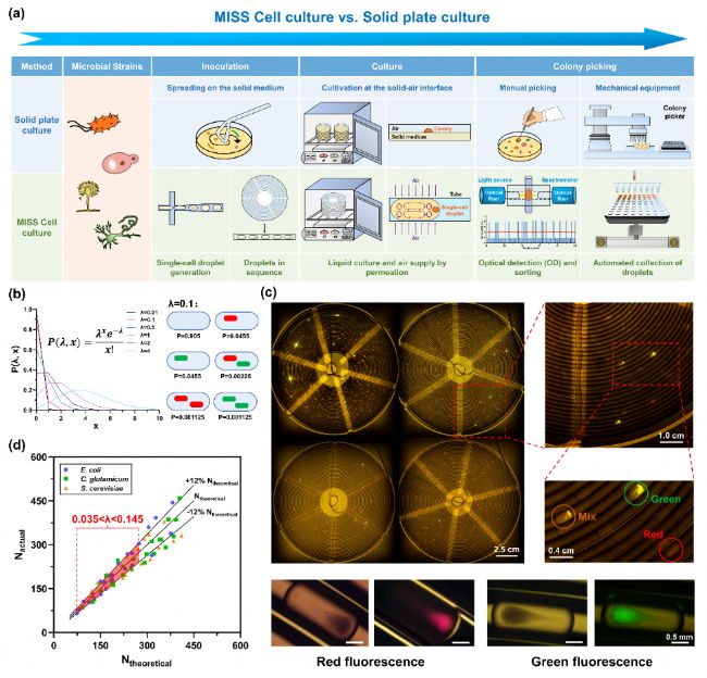 圖2 MISS Cell中單克隆培養(yǎng)和分選的操作流程和驗(yàn)證結(jié)果。(a)固體平板方法和MISS Cell培養(yǎng)方法的操作流程比較;(b)單細(xì)胞液滴生成的原理和雙色熒光菌體系驗(yàn)證原理;(c)使用紅色和綠色熒光標(biāo)記的大腸桿菌的驗(yàn)證結(jié)果,λ=0.086;(d)使用大腸桿菌、谷氨酸棒桿菌和釀酒酵母進(jìn)行驗(yàn)證的結(jié)果匯總。