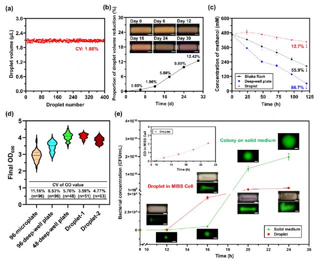 圖3 MISS Cell中微升級液滴性能表征。(a)生成液滴的體積變化;(b)液滴揮發(fā)情況;(c)液滴中底物(以甲醇為例)的揮發(fā)情況;(d)不同方法微生物培養(yǎng)的平行性;(e)微升級液滴和固體平板中單菌落生長速率比較。Scale bar = 400 μm。
