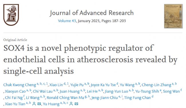 參考文獻:Cheng CK, Lin X, Pu Y, Tse JKY, Wang Y, Zhang CL, Cao X, Lau CW, Huang J, He L, Luo JY, Shih YT, Wan S, Ng CF, Wang L, Ma RCW, Chiu JJ, Chan TF, Yu Tian X, Huang Y. SOX4 is a novel phenotypic regulator of endothelial cells in atherosclerosis revealed by single-cell analysis. J Adv Res. 2023 Jan;43:187-203. doi: 10.1016/j.jare.2022.02.017. Epub 2022 Mar 1. PMID: 36585108.