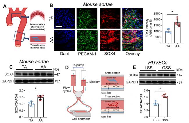 (A)沿主動脈的不同流動模式示意圖。(B)小鼠胸主動脈(TA)和主動脈弓(AA)的面部SOX4表達的免疫熒光染色。(C)小鼠TA和AA中SOX4水平的蛋白質印跡。(D)流動系統(tǒng)設計示意圖和細胞室橫截面。(E)暴露于LSS或OSS 24小時的HUVECs中SOX4水平的蛋白質印跡。