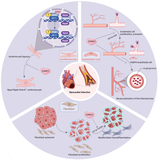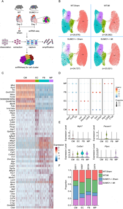 SUMO化修飾是一種動(dòng)態(tài)的翻譯后修飾,可維持心臟功能,并可保護(hù)心臟壓力過(guò)載的肥厚反應(yīng)。然而,心肌梗死(MI)后SUMO化修飾的功能以及心臟細(xì)胞對(duì)SUMO1缺陷反應(yīng)的分子機(jī)制尚未確定。在本研究中,作者構(gòu)建了SUMO1-/-小鼠模型,通過(guò)單細(xì)胞核RNA(snRNA-seq)測(cè)序揭示了SUMO1在調(diào)節(jié)心臟細(xì)胞中的不同作用。