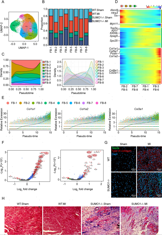 為了探索FB亞群在MI后心臟重塑中的作用,作者將FBs細(xì)分為8個(gè)簇(FB1-8),MI后,F(xiàn)B亞群大幅增殖 (圖4B)。作者使用CytoTrace分析FBs的分化軌跡,結(jié)果顯示,F(xiàn)B-2和FB-5簇(Postn、Col1a1和Col1a2低表達(dá))是初始狀態(tài)FBs亞群, FB-3和FB-6簇(Col1a1, Col1a2和Col3a1高表達(dá))是終末期FBs。與WT小鼠相比,MI后SUMO1-/-小鼠的FB-3和FB-6簇的比例有所降低。然而,F(xiàn)B-4簇的比例顯著增加,F(xiàn)B-4簇處于分化中間狀態(tài),高表達(dá)增殖相關(guān)基因,表明其處于增殖狀態(tài)。使用Top2a和III型膠原進(jìn)行免疫熒光染色顯示,與WT小鼠相比,SUMO1缺失導(dǎo)致MI后梗死區(qū)FB大量增殖,但膠原分泌減少(圖4G)。I型和III型膠原免疫組化染色顯示,SUMO1缺失減少了MI后膠原分泌。作者發(fā)現(xiàn)SUMO1缺失引發(fā)梗死區(qū)部分破裂,提示修復(fù)能力不足(圖4H)。這些發(fā)現(xiàn)表明,多個(gè)FB亞群參與了MI后修復(fù)反應(yīng),SUMO1缺失抑制了FBs從增殖狀態(tài)向膠原分泌狀態(tài)的分化。