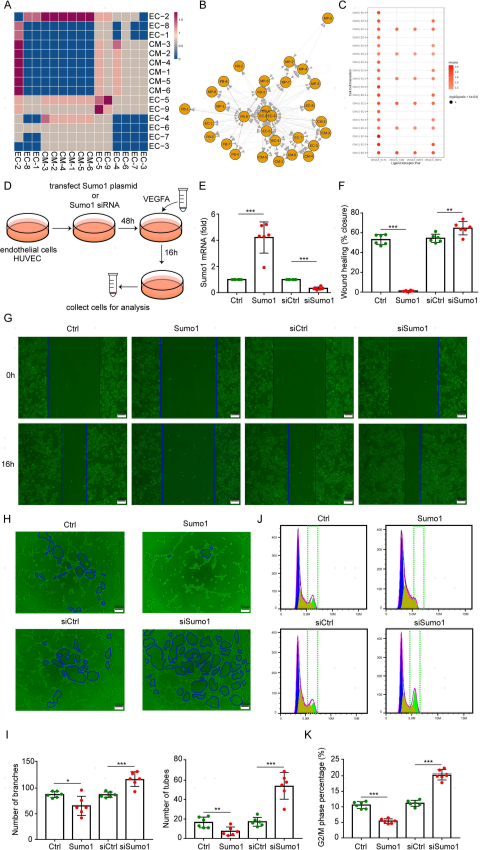 為了進(jìn)一步研究心臟中不同細(xì)胞類型之間的通信網(wǎng)絡(luò),作者使用CellPhoneDB進(jìn)行了全面和系統(tǒng)的分析(圖6A)。EC2、EC-5和EC-9簇作為負(fù)責(zé)EC激活、冠狀動(dòng)脈/小動(dòng)脈血管生成和重建的EC亞群,受到CMs分泌的VEGFA的調(diào)控(圖6C)。為了研究SUMO1缺失是否促進(jìn)VEGFA介導(dǎo)的EC增殖,作者將SUMO1沉默(siSUMO1)和SUMO1過(guò)表達(dá)質(zhì)粒轉(zhuǎn)染人臍靜脈EC(HUVECs)(圖6D和E)。在體外實(shí)驗(yàn)中,SUMO1的沉默顯著增強(qiáng)了VEGFA誘導(dǎo)的HUVECs的增殖和遷移能力(圖6F和G)。為了進(jìn)一步確定SUMO1是否介導(dǎo)VEGFA的血管生成信號(hào),作者進(jìn)行了基質(zhì)管形成實(shí)驗(yàn)。在HUVECs中,SUMO1的沉默顯著促進(jìn)了VEGFA誘導(dǎo)的EC小管形成,而過(guò)表達(dá)SUMO1則導(dǎo)致了小管和分支數(shù)量的減少(圖6H和I)。此外,SUMO1基因沉默增加了VEGFA介導(dǎo)的HUVECs G2/M比例(圖6J和K)。這些發(fā)現(xiàn)表明,VEGFA促進(jìn)EC增殖的作用被SUMO1抑制,這不利于MI后的血管新生和血管重建。