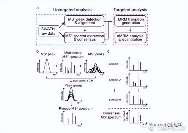圖1. (a) SWATHtoMRM 技術(shù)流程概覽。 (b) 從SWATH數(shù)據(jù)中提取虛擬MS²圖譜。 (c) 將來自多個(gè)樣品的MS²譜圖合并為consensus 譜圖,保留出現(xiàn)頻率超過50%的碎片離子,并用于生成MRM離子對。