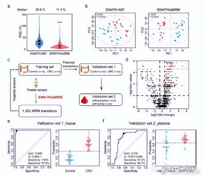 為了評估SWATHtoMRM技術(shù)的實(shí)用性能,作者將該技術(shù)運(yùn)用于結(jié)腸癌(CRC)診斷標(biāo)志物的發(fā)現(xiàn)研究(18對樣品作為訓(xùn)練集,42對用作驗(yàn)證集)。利用pooled QC樣品構(gòu)建了1705個(gè)MRM離子對,并成功檢測到了其中的1303(76.4%)個(gè)代謝物。總共有1213(93.1%)個(gè)代謝物在>4個(gè)實(shí)際組織樣品中加測到,并用于后續(xù)統(tǒng)計(jì)分析。從QC樣品的RSD以及PCA分析結(jié)果來看,SWATHtoMRM在重復(fù)性和靈敏度方面顯著優(yōu)于SWATH-MS¹技術(shù),主要表現(xiàn)在更低中位RSD值和較窄的RSD分布(圖5a),以及PCA得分圖中更小的組內(nèi)離散度和更大的組間分離度(圖5b)。