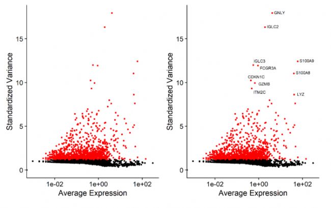 降維的過程依賴于基因表達(dá)量,因此挑選那些更能代表整體差異的基因進(jìn)行降維分析是非常關(guān)鍵的,一般來說如果一個(gè)基因在細(xì)胞群體中變化幅度很大,它就是受關(guān)注對(duì)象,我們會(huì)認(rèn)為是生物因素導(dǎo)致了這么大的差異,該基因即為高度變化基因(highly variable genes ,HVGs)。