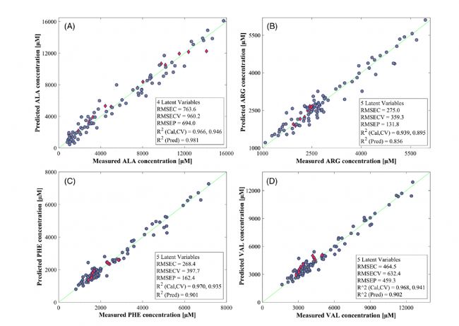 圖2:在PLS回歸過程中,拉曼預測和離線測量數(shù)據(jù)之間的相關(guān)性:丙氨酸(A)、精氨酸(B)、苯丙氨酸(C)和纈氨酸(D)。校準數(shù)據(jù)集用灰色圓圈表示,測試數(shù)據(jù)集用紅色菱形表示