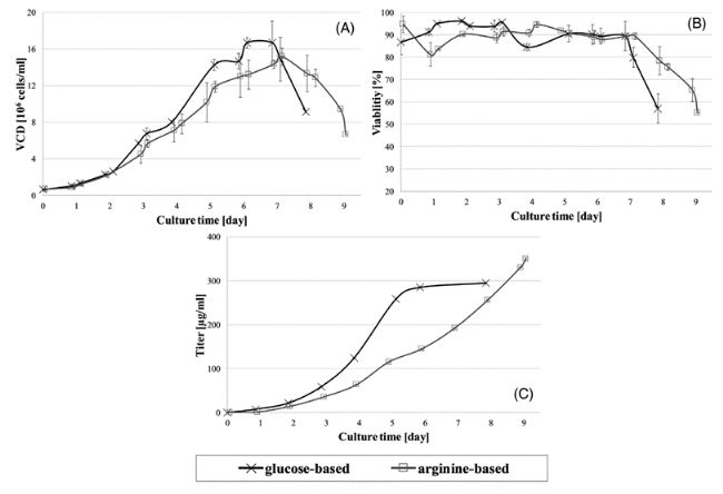 為了細胞建立更有益的營養(yǎng)環(huán)境,結(jié)合拉曼模型(葡萄糖和精氨酸)的預測,采用了兩種動態(tài)補料策略來控制兩部分多組分(two-part multi-component )培養(yǎng)基的添加。因此,營養(yǎng)物質(zhì)能(葡萄糖和氨基酸)保持在相對穩(wěn)定的水平,而不是高波動,這為細胞提供了一個更平衡的環(huán)境。此外,與葡萄糖動態(tài)補料培養(yǎng)相比,基于氨基酸的補料控制可以防止營養(yǎng)物質(zhì)過量,并顯著減少培養(yǎng)基的供給,具有經(jīng)濟效益。
