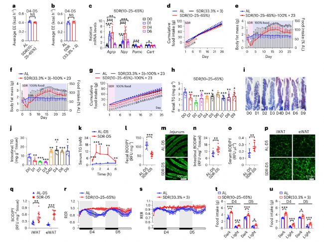 作者進(jìn)一步研究了SDR后脂肪量快速積累的機(jī)制,結(jié)果發(fā)現(xiàn)SDR后小鼠的能量消耗、身體活動(dòng)和體溫沒有顯著變化,且累積食物攝入量對(duì)SDR后的快速脂肪量積累也沒有顯著的積極貢獻(xiàn)。但是SDR后腸道脂質(zhì)吸收明顯增強(qiáng),增強(qiáng)的腸道脂質(zhì)吸收有助于SDR后脂肪量的快速積累,且數(shù)據(jù)表明脂肪組織中脂肪酸攝取和脂質(zhì)合成的增加以及總脂質(zhì)氧化的減少有助于SDR后脂肪量的快速積累(圖2)。