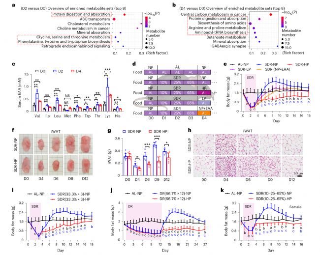 為了尋求潛在的飲食干預(yù)措施以阻止節(jié)食后脂肪量的增加,作者在SDR之前、期間和之后對(duì)血清中的代謝產(chǎn)物進(jìn)行了非靶向代謝組學(xué)研究,發(fā)現(xiàn)差異血清代謝物主要集中在蛋白質(zhì)消化吸收、氨基酸代謝、氨基酸生物合成及相關(guān)途徑,除甲硫氨酸外的必需氨基酸(EAAs)以及一些半必需氨基酸和非必需氨基酸在SDR期間和之后顯著增加。為了進(jìn)一步探索氨基酸對(duì)SDR后快速脂肪量積累的潛在影響,作者在3天內(nèi)分別喂食10%、25%和65%的食物量后,用HP飲食、低蛋白飲食和補(bǔ)充EAAs的正常蛋白質(zhì)(NP)飲食喂養(yǎng)小鼠,結(jié)果發(fā)現(xiàn)SDR后喂養(yǎng)的所有三種日糧都阻止了脂肪量的快速積累,尤其是HP飲食甚至部分維持了SDR誘導(dǎo)的脂肪減少效果。表明節(jié)食后的脂肪量增加可以通過飲食干預(yù)來預(yù)防,特別是以HP飲食的形式(圖3)。