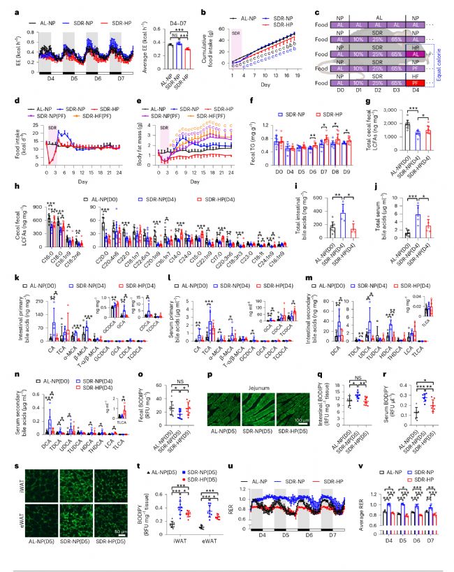作者進(jìn)一步研究了HP飲食是如何阻止SDR后脂肪量快速積累的機(jī)制,結(jié)果表明HP飲食對(duì)SDR后快速脂肪量積累的抑制作用不是由于能量消耗的增加和熱量攝入的差異,主要是由飲食成分的差異造成。與SDR后喂食NP飲食的小鼠相比,SDR后喂食HP飲食的小鼠的糞便甘油三酯(TG)和盲腸糞便總長(zhǎng)鏈脂肪酸(LCFAs)均顯著增加,表明HP飲食導(dǎo)致腸道脂質(zhì)吸收減少,且發(fā)現(xiàn)HP飲食誘導(dǎo)的脂肪組織中脂肪酸攝取和脂質(zhì)合成減少以及總脂質(zhì)氧化增加有助于預(yù)防SDR后脂肪量的增加(圖4)。