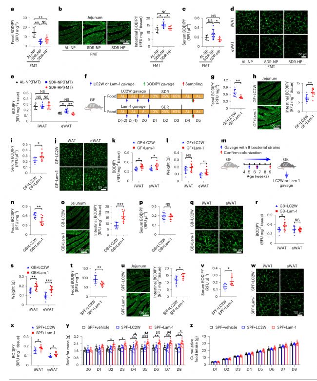 作者進(jìn)一步通過糞菌移植實(shí)驗(yàn)研究了腸道菌群對(duì)腸道吸收和白色脂肪組織的脂肪酸攝取的影響,結(jié)果發(fā)現(xiàn)轉(zhuǎn)移SDR-NP組糞菌的受體小鼠腸道脂質(zhì)吸收和白色脂肪組織中的脂肪酸攝取顯著增加,而在轉(zhuǎn)移SDR-HP組糞菌的受體小鼠中,這一增加被顯著抑制。更進(jìn)一步地,在無菌(GF)小鼠、悉生(GB)小鼠以及無特定病原體(SPF)的小鼠上的研究發(fā)現(xiàn),補(bǔ)充乳酸桿菌Lam-1可以顯著增強(qiáng)腸道脂質(zhì)吸收,增加白色脂肪組織的脂肪酸攝取,并誘導(dǎo)脂肪堆積(圖6)。