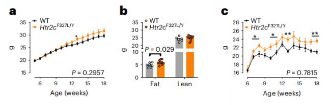 進一步通過CRISPR-Cas9 技術將5-HT2CR-F327L 突變體敲入小鼠(簡稱F327L 突變體小鼠)后,即便是在普通飲食后出現(xiàn)過度攝食、體重增加,脂肪脂肪增多。在高脂飲食后可加速小鼠肥胖。5-HT2CR激動劑可抑制小鼠食欲,但這種抑制作用在F327L 突變體小鼠中被減弱,這就表明5-HT2CR-F327L 突變體通過促進攝食增加體重。
