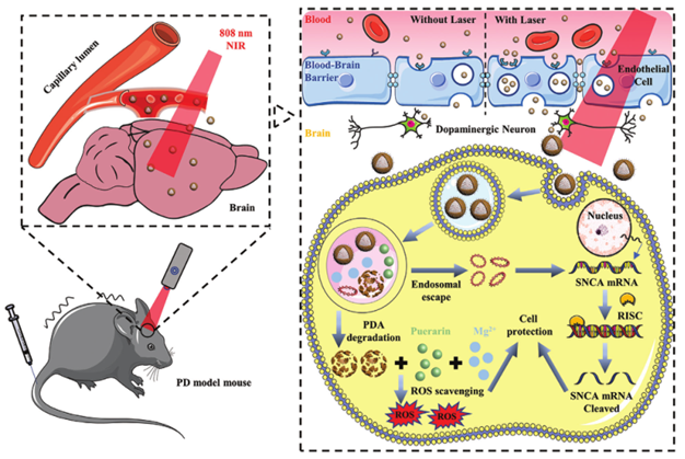 MgOp@PPLP通過血液循環(huán)到達(dá)血腦屏障,并在近紅外輻射的幫助下穿透血腦屏障,進(jìn)入到神經(jīng)細(xì)胞中。隨之,NPs被運(yùn)輸?shù)饺苊阁w,在PDA殼解體后,釋放pDNA和Pue。pDNA可以表達(dá)siRNA,通過SNCA mRNA降解抑制α-syn表達(dá);PDA和Pue能清除細(xì)胞內(nèi)的ROS,達(dá)到保護(hù)神經(jīng)細(xì)胞和治療PD的目的。