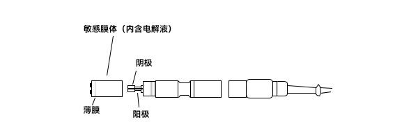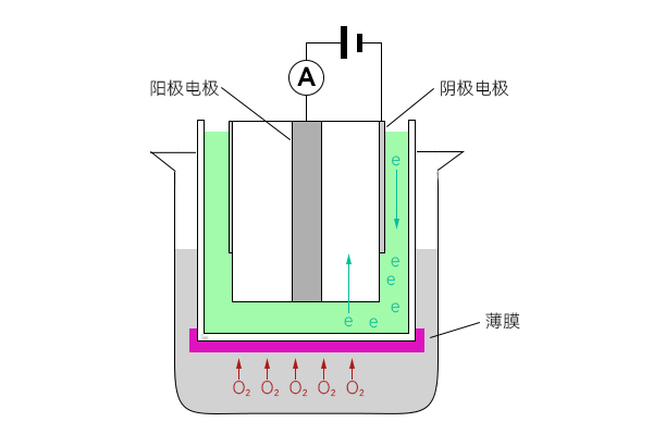 在使用過程中,溶解氧通過薄膜到達(dá)陰極表面時會被電解分離,釋放出的電子會在電解液中形成電流。由于透過膜的溶氧含量與水中的溶氧含量成正比,所以在溶氧含量不同的情況下,電解液中形成的電流強度是不同的,電流強度可以通過電極來監(jiān)測。電極監(jiān)測到的電流強度可以根據(jù)法拉第(Faraday)定律換算成特定的氧氣濃度,經(jīng)過補償溫度和氣壓得到最終值。