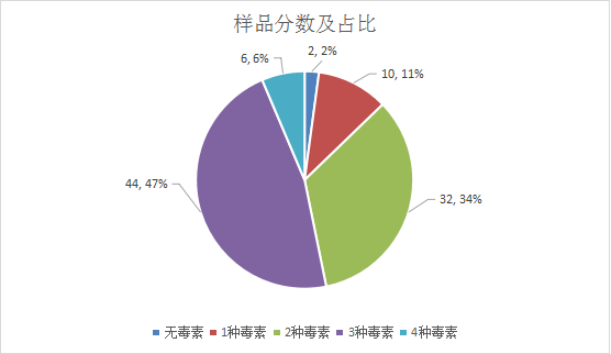 對(duì)96份玉米的6類(lèi)真菌毒素檢測(cè)結(jié)果進(jìn)行分析匯總,所有樣品均未檢出赭曲霉毒素和T-2毒素。96份玉米中有2份玉米不含有這6類(lèi)真菌毒素,10份玉米只含有1類(lèi)真菌毒素,32份玉米含有2類(lèi)真菌毒素,44份玉米含有3類(lèi)真菌毒素,6份玉米含有4類(lèi)真菌毒素。