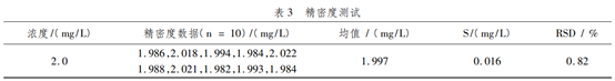 以2.0 mg/L加標(biāo)樣作測試樣,重復(fù)測試10次,得到測試精密度,結(jié)果見表3。