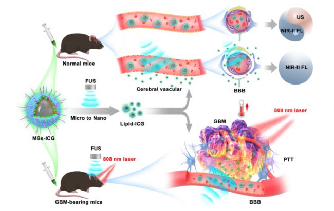 在這項工作中,作者報道了吲哚菁綠(ICG)負載的脂質微泡(MBs-ICG)用于FUS誘導的BBB打開和原位可視化,以及增強光熱療法(PTT)對GBM的作用。ICG是一種經(jīng)美國食品和藥物管理局(FDA)批準用于體內(nèi)臨床應用染料,具有明亮的NIR-II熒光和高效的光熱性能。MBs-ICG與FUS結合不僅可以打開BBB,而且在FUS照射下MBs-ICG轉化為脂質-ICG納米顆粒(NPs),用于BBB開口的NIR-II熒光可視化和增強PTT對GBM的抑制。作者評估了MBs-ICG在正常小鼠和原位GBM小鼠模型中的成像和治療潛力,為監(jiān)測BBB開放和加強GBM治療提供了一種可視化方法。