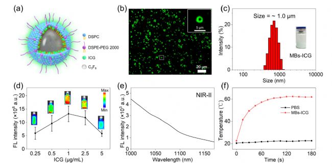 薄膜水合法用于制備MBs-ICG,使用FDA批準的賦形劑,包括DSPC,DSPE-PEG2000、ICG和C3F8氣體(圖1a)。熒光顯微鏡圖像顯示MBs-ICG分散良好,具有核/殼結構(暗C3F8 氣體核心和脂質殼表現(xiàn)出明亮的熒光)(圖1b)。使用動態(tài)光散射(DLS)測量MBs-ICG的平均流體動力學直徑,導致1.0±0.17μm(圖1c),小于商業(yè)MB的直徑(例如SonoVue,尺寸= 2.5μm)。為了優(yōu)化MBs-ICG的光學性能,作者研究了摻雜ICG濃度對MBs-ICG熒光強度的影響。最大化ICG熒光并減少聚集誘導熒光猝滅的最佳ICG濃度為1μg/ mL(圖1d)。其次,測量了MBs-ICG和游離ICG的吸收光譜,結果表明,與游離ICG相比,MBs-ICG的吸收峰表現(xiàn)出從783 nm到785 nm的紅移。在MBs-ICG的NIR-II窗口中檢測到典型的拖尾熒光發(fā)射(圖1e)。與相同濃度下的游離ICG相比,MBs-ICG的NIR-II強度提高了13.4%。一個可能的原因是,疏水單層MBs中的ICG重排抑制了ICG的分子聚集并增強了其熒光發(fā)射。最后,采用功率密度為1 W/cm的808 nm激光器照射,研究了MBs-ICG的光熱性能2.MBs-ICG的光熱溫度在3 min內(nèi)提高了39.4°C(圖1f),顯示出良好的光熱性能。