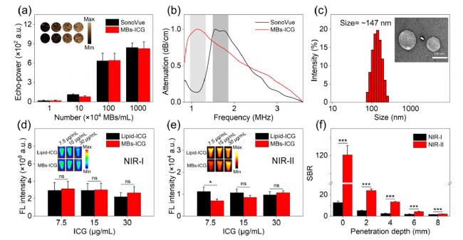 ICG摻雜到MB的脂質層中賦予它們超聲波和熒光特性。首先,作者使用Vevo 2100高分辨率成像系統(tǒng)評估了MBs-ICG的超聲特性,該系統(tǒng)顯示出濃度依賴性對比度增強(圖2a)。MBs-ICG的圖像對比度與商業(yè)微泡相當(SonoVue,2.5μm)。然而,MBs-ICG(∼1 MHz)的諧振頻率低于SonoVue(1.48–1.89 MHz)(圖2b)。MBs-ICG頻率的降低保證了超聲成像和治療的高組織滲透性和良好的生物安全性[38]。在頻率為1 MHz的超聲處理1 min后,MBs-ICG轉化為脂質-ICG NPs。TEM和DLS測量表明,所得脂質-ICG NPs為球形,平均流體動力學直徑為∼147 nm(圖2c)。在轉化過程中,脂質-ICG NPs的熒光在第一個近紅外(NIR-I,650–950 nm)窗口和NIR-II窗口與MBs-ICG相比沒有衰減(圖2d和e)。這允許對具有深層組織穿透力(∼8 mm)的MBs-ICG進行NIR-II熒光成像(圖2f和圖)。S5在線)。綜上所述,本研究制備的MBs-ICG具有良好的超聲和熒光對比度以及超聲誘導的尺寸轉化特性。