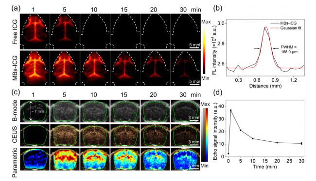 MBs-ICG優(yōu)異的體外超聲和NIR-II熒光性能允許進一步評估小鼠模型中的體內(nèi)雙模態(tài)成像。在MBs-ICG處理組中,用明亮的NIR-II熒光觀察到腦血管結構,包括腦下靜脈和頭皮下的腦毛細血管,但在游離ICG處理組中則未觀察到(圖3a和圖)。S6在線)。MBs-ICG處理小鼠的成像時間窗口達到30分鐘,而游離ICG處理小鼠的相應值僅為5分鐘。來自MBs-ICG處理的小鼠的腦血管系統(tǒng)圖像的高斯擬合在治療后1分鐘提供了高達168.9μm的血管分辨率(圖3b),為高分辨率腦血管成像提供了機會。接下來,我們進一步采用MBs-ICG的超聲灌注成像來可視化顱窗小鼠模型中的腦脈管系統(tǒng)。MBs-ICG的成像時間窗口保持>30 min,成像深度達到∼7 mm(圖3c和d),與NIR-II熒光成像相似。然而,由于超聲成像的分辨率低,很難無創(chuàng)地獲得腦血管結構的圖像。綜上所述,這些結果揭示了本研究制備的MBs-ICG在互補NIR-II熒光和超聲腦血管成像方面的優(yōu)勢。