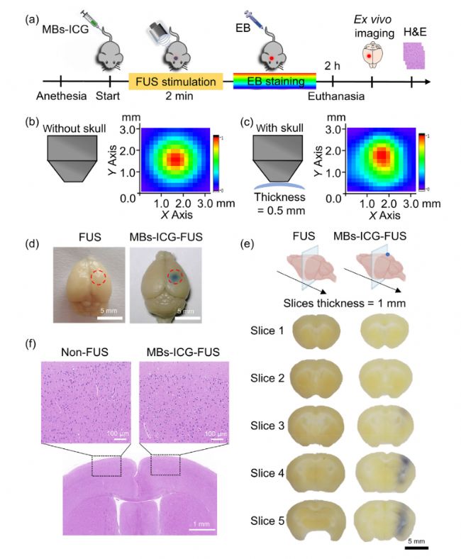 MBs-ICG與FUS的組合用于小鼠模型中的BBB打開(圖4a)。在這里,我們描述了遵循的一般程序。靜脈注射MBs-ICG后對小鼠大腦進行超聲處理2分鐘(∼1×109氣泡/毫升)。通過EB染色確認BBB的開放區(qū)域,并在腦組織的病理切片中評估超聲處理過程的安全性。首先,使用校準的0.5毫米針式水聽器研究了顱骨厚度對局灶性FUS區(qū)域的影響[39]。如圖4b所示,在沒有頭骨的情況下,焦點直徑為∼2.5 mm,在存在0.5 mm小鼠頭骨的情況下,只有微小的尺寸和形狀變形(圖4c)。這一結果表明,小鼠頭骨不影響B(tài)BB開口范圍。接下來,我們采用EB染色來檢測BBB滲透率[40],[41],[42]。MBs-ICG-FUS處理組在右半球顯示一個藍點,在FUS處理組中不存在,表明成功定位BBB開口(圖4d)。此外,腦切片分析表明,BBB開口深度可以穿透整個腦組織(圖4e)。最后,腦組織的H&E染色分析顯示FUS誘導的BBB開放后沒有出血,紅細胞外滲或損傷(圖4f)。這些結果表明,MBs-ICG與FUS相結合可以以非侵入性,特定地點和高度安全的方式打開BBB。